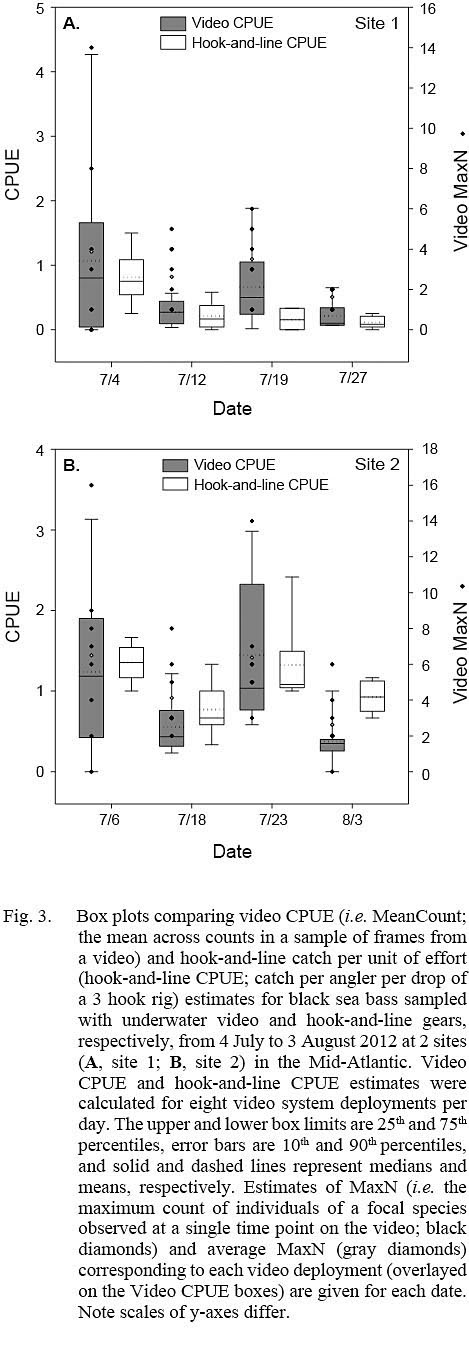 A total of 64 (n = 32) video system deployments and 768 (n = 384 per site) hook rig drops were made during the study period. Estimates of CPUE (hereafter referred to as hook-and-line CPUE) for black sea bass sampled with hook-and-line gear were calculated as the number of fish caught per 3 min drop of a 3 hook rig. Values were averaged across the three fishers to obtain a single hook-and-line CPUE value corresponding to each video system deployment (n = 32 for each site; n = 8 per day).